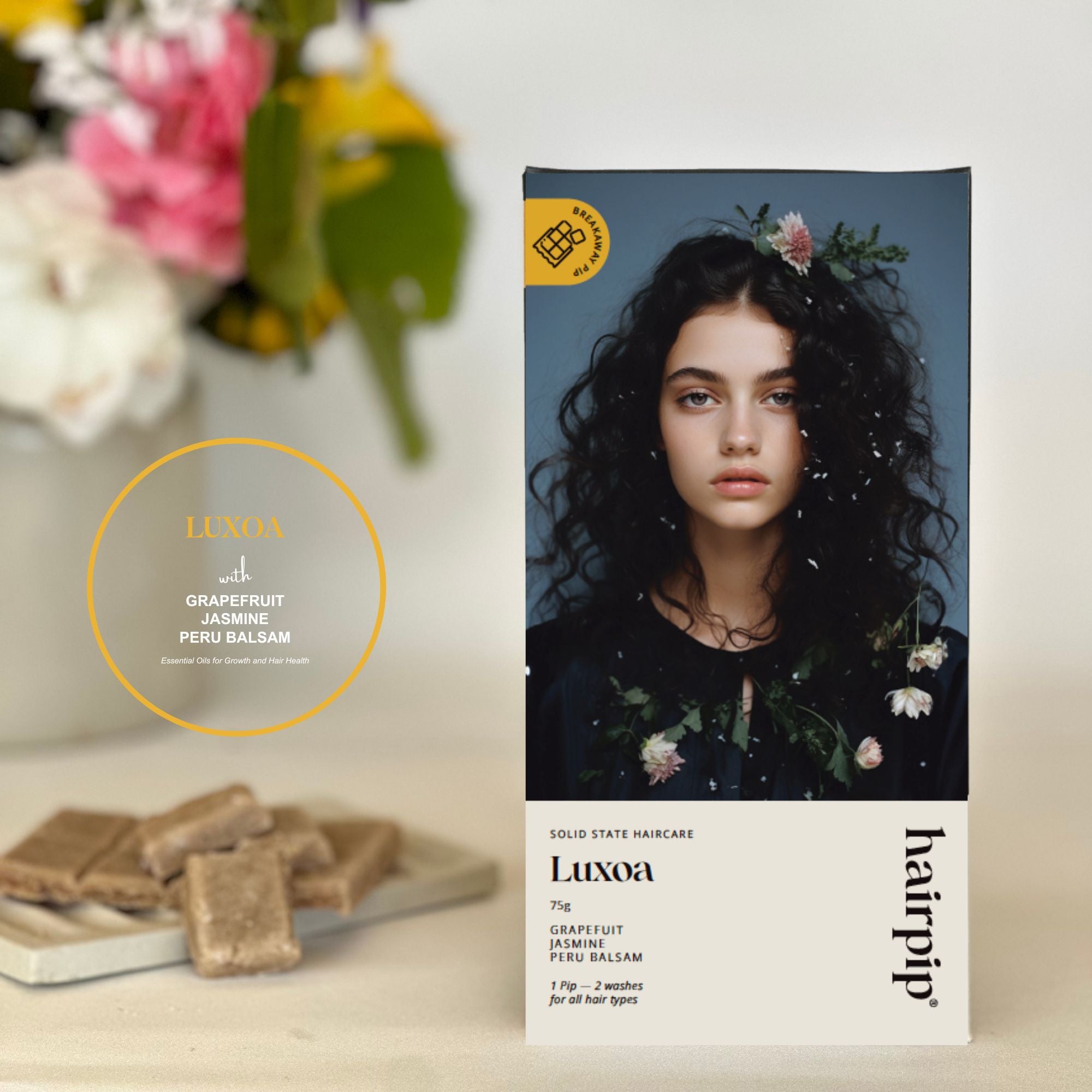 Inspired by the shampoo bar, but done differently. We wanted to have small portions, just like chocolate and its satisfying sensation of breaking away one square at a time. Hairpip needed a name for these portions, so the "pip" was born.